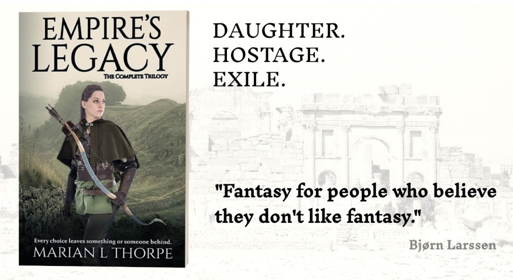 I call the books historical fantasy for lack of anything else to call them. There is no magic, no timeslips, no elves or dragons, nothing from the realms of fantasy at all. But neither are they alternative history, because their setting is not quite our world, although it bears many similarities to Europe after the decline of Rome. On the face of it, Empire’s Legacy is simply a heroine’s journey, physically and psychologically. When we meet Lena, she’s a naïve village girl who responds, from a sense of duty and adventure, to a request from her Emperor to help defend her land. Over the course of the trilogy, she becomes a skilled soldier, but also a woman who knows all too well the price of war. The major theme is this, in my character Casyn’s words: We cannot shape the circumstances to fit our lives, only our lives to fit the circumstances. What defines us, as men and women, is how we respond to those circumstances.