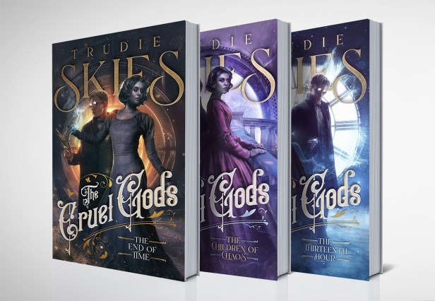 The End of Time is the third and final book in The Cruel Gods series—a gaslamp fantasy featuring magical portals, gothic cosmic deities, quaint Britishisms, and steampunk vibes. This is an adult book containing strong language and mature themes that some readers may find disturbing. For a full list of content warnings, visit Trudie Skies’s website.